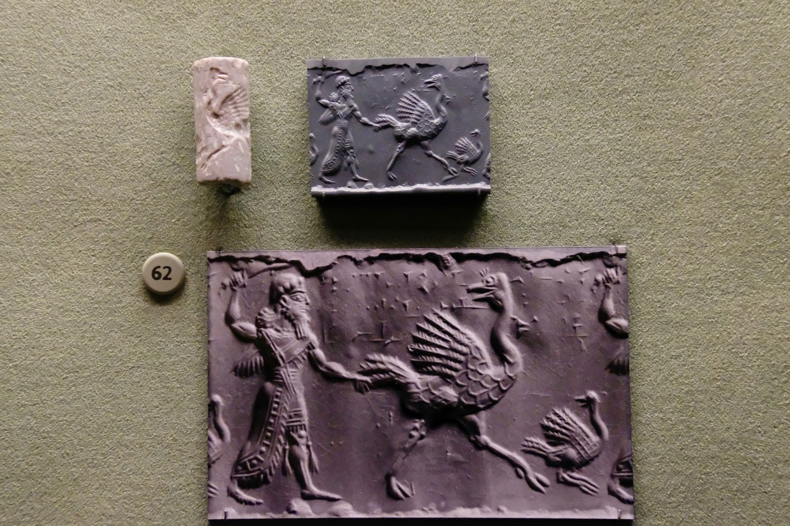 In one of the most striking of the Morgan's Middle Assyrian seals, a hero pursues an adult ostrich, possibly representing the earthly equivalent of the griffin, the conveyor of death. The fleeing ostrich, with its head turned back in fear and fury and its feathers bristling, ranks among the greatest Mesopotamian depictions of animals. In the biblical Book of Job (39:13–17), the ostrich is considered a malevolent creature because it disdains its young, which may account for the presence of the young ostrich and enhances our understanding of this extraordinary seal.